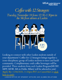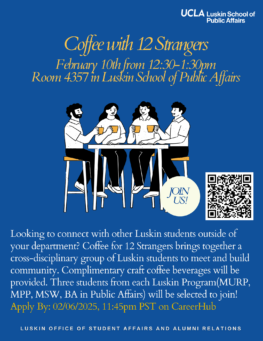 Looking to connect with other Luskin students outside of your department? Coffee for 12 Strangers brings together a cross-disciplinary group of Luskin students to meet and build community. Complimentary craft coffee beverages will be provided.