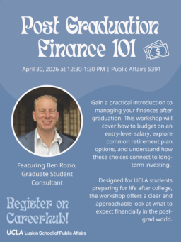 Calling all Luskin students and graduates, please join the UCLA Financial Wellness team to learn about budgeting a post-grad salary, popular retirement plan options and how they connect to investing. This workshop is for students who would like a glimpse of what to expect post-graduation from UCLA.