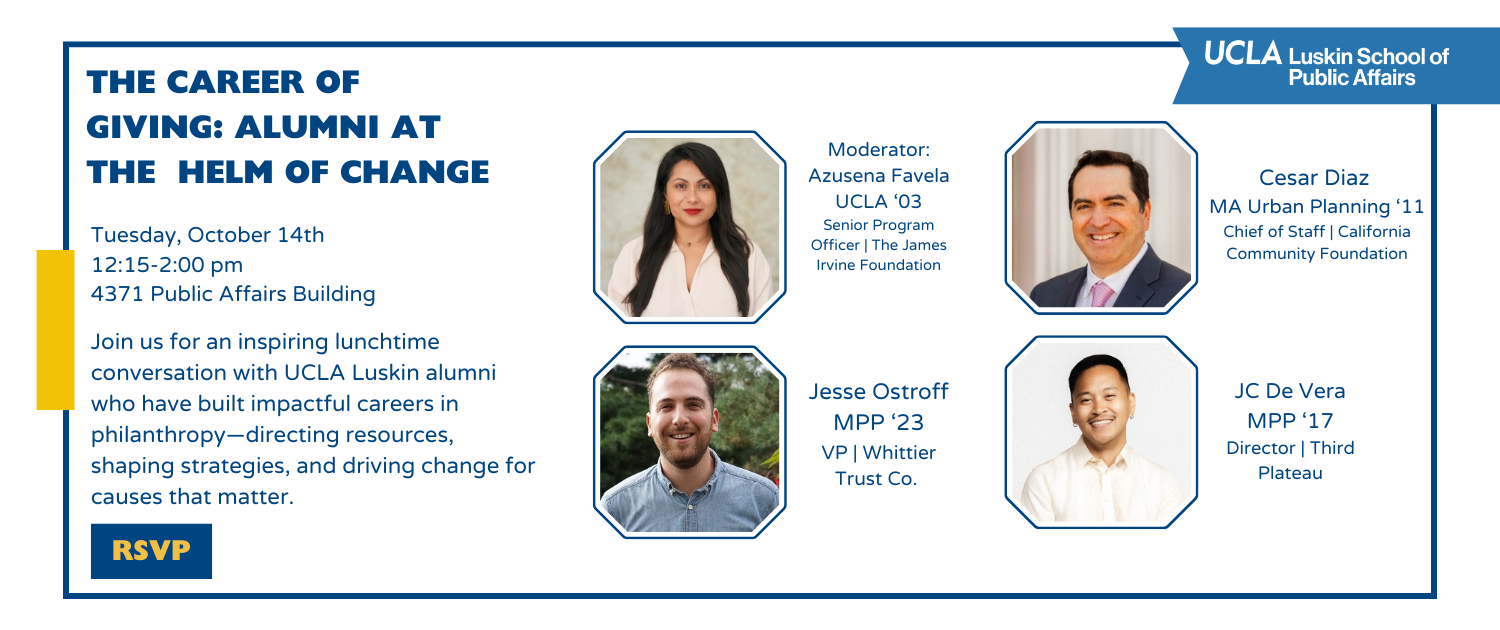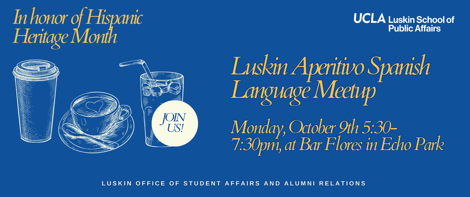If you want to promote your organization, job opportunities and meet qualified and department-specific students, please contact Kevin Medina, at kmedina@luskin.ucla.edu.  You are welcome to present in person or by Zoom.