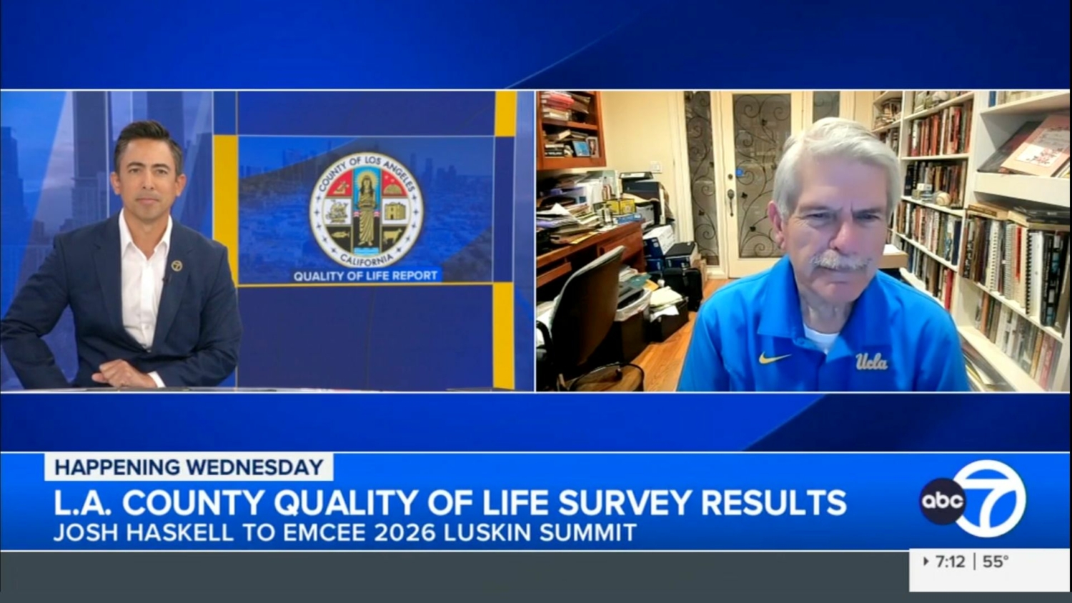 Zev Yaroslavsky appeared on ABC7 Los Angeles to discuss findings from the Los Angeles County Quality of Life Index (QLI), which will be released April 15 at the 2026 Luskin Summit. The annual survey, conducted since 2016, asks residents to rate their quality of life across nine different categories, including cost of living, education, the economy, healthcare, and sentiments around their neighborhood.